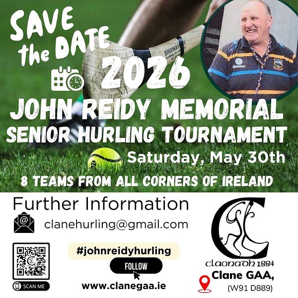 We are delighted to announce that we will once again host the John Reidy Memorial Senior Hurling Tournament on Saturday, May 30th.